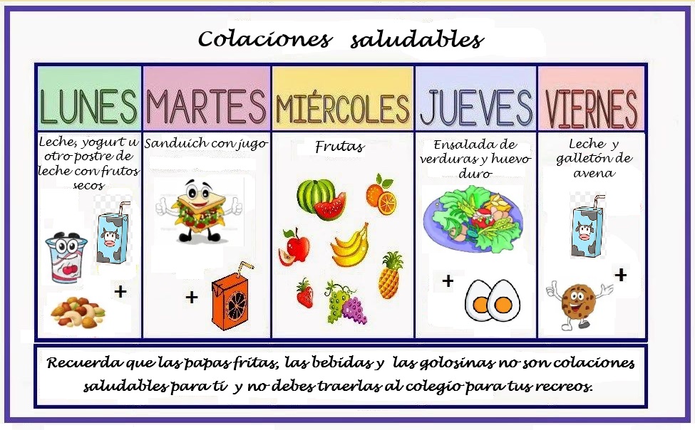 Estimada comunidad educativa Junto con saludar, compartimos con ustedes una sugerencia para mejorar el bienestar de nuestros niños, la implementación de una minuta de colaciones saludables. El objetivo es facilitar