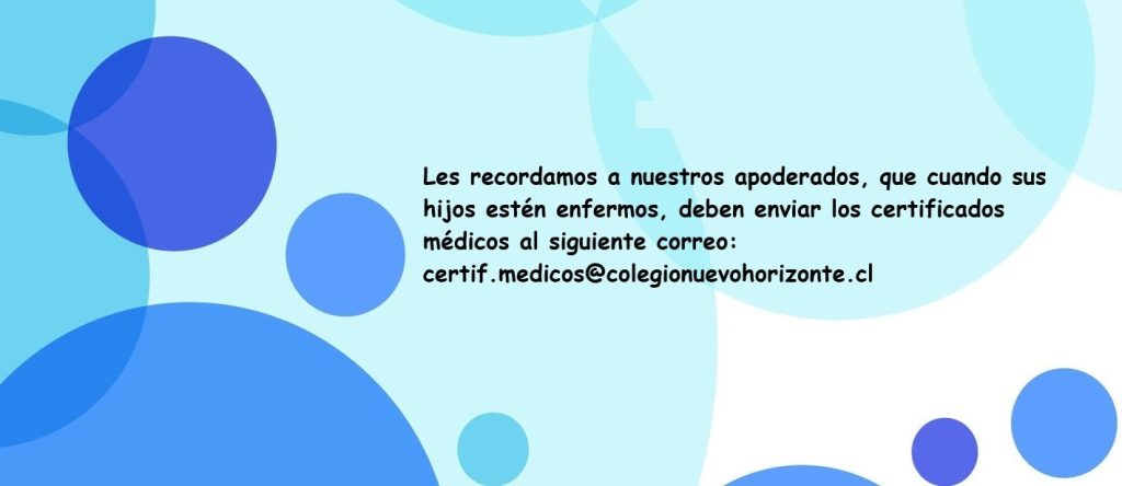 Si su hijo está enfermo y usted considera necesario llevarlo al médico o a algún centro de salud, debe solicitar un certificado para ser presentado en el colegio o ser enviado directamente al correo correspondiente, certif.medicos@colegionuevohorizonte.cl. Estos serán recibidos por los inspectores quienes informarán a los profesores la situación de cada estudiante.